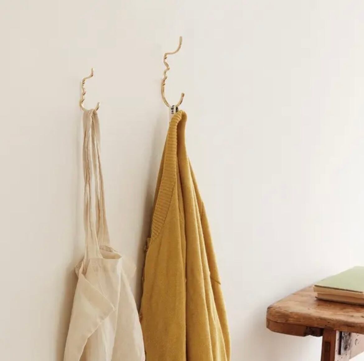 鉄などと比べると真鍮は柔らかく変形しやすいため、薄手のコートやエコバッグ、帽子など軽量な物の収納にお使いいただけます。